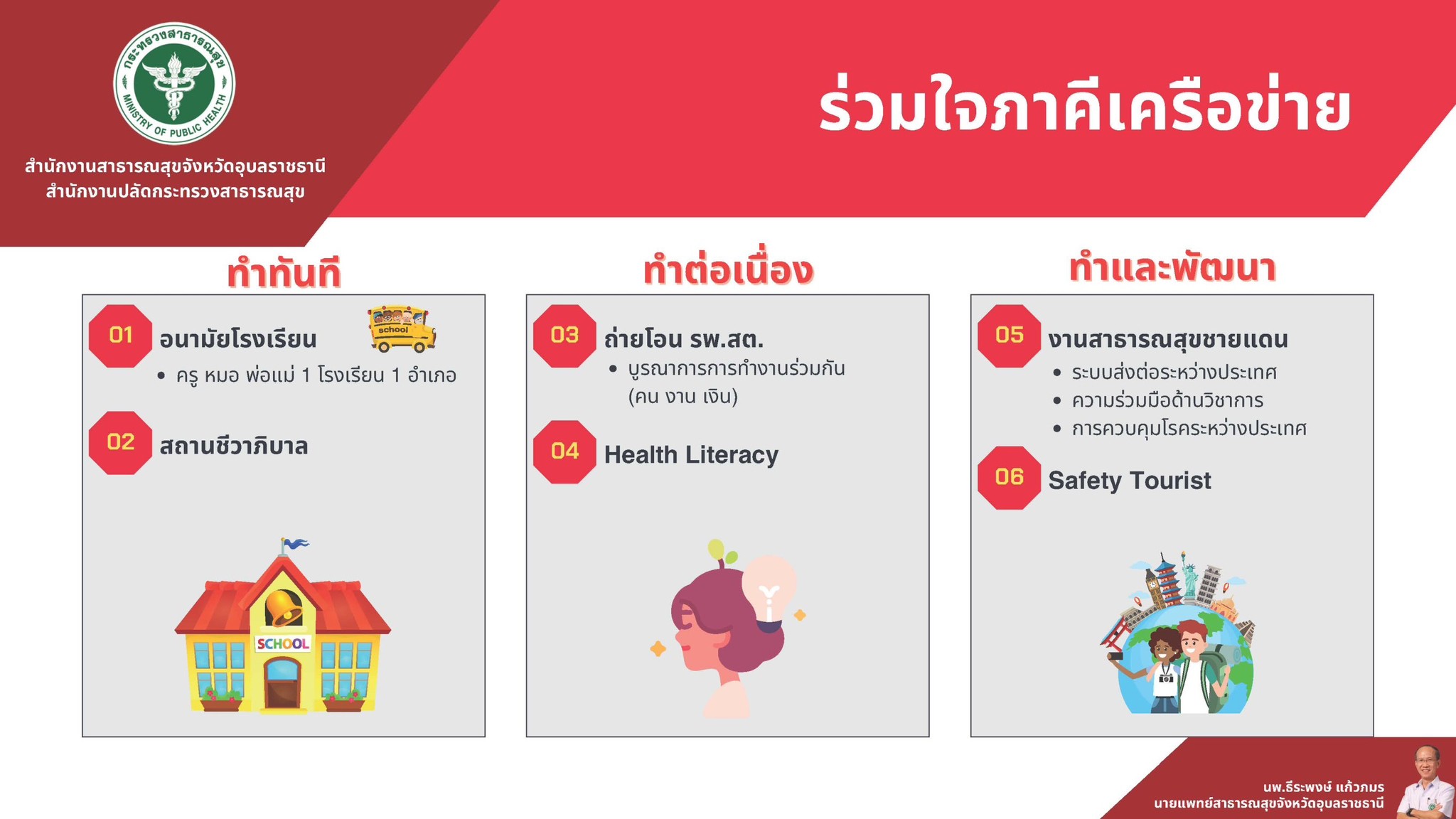 นโยบาย ยุทธศาสตร์ แผนงาน ยุทธศาสตร์ชาติ 20 ปี ของประเทศโดยรวม นโยบายการดำเนินงานสาธารณสุข ของรมว.สาธารณสุขปี 2567 ทิศทางการพัฒนาสู่ระบบสุขภาพเข้มแข็ง รมช.สาธารณสุข ปี 2567 นโยบายมุ่งเน้น สธ. 67ฉบับเผยแพร่ แผนขับเคลื่อนนโยบายมุ่งเน้น สธ. 67 v.4 สำนักงานสาธารณสุขจังหวัดอุบลราชธานี เอกสารเล่มตรวจราชการกระทรวงสาธารณสุข 67 แผนปฏิบัติราชการสาธารณสุขปีงบ 25657version30_NOV_2021 นโยบายนายแพทย์สาธารณสุขจังหวัดอุบลราชธานี ปี 2567